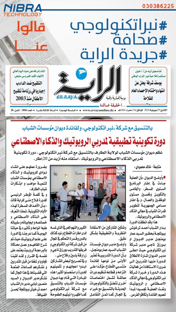 #صحافة #قالوا_عنا #errayajournal #نبرا_تكنولوجي #إعلان #الروبوتيك #ديوان_مؤسسات_الشباب #نبرا نشكر جريدة الراية لتغطية الدورة التكوينية لفائدة مدربي الروبوتيك و الذكاء الإصطناعي لفائدة ديوان مؤسسات الشباب بالطارف بالتنسيق مع شركة نبرا تكنولوجي